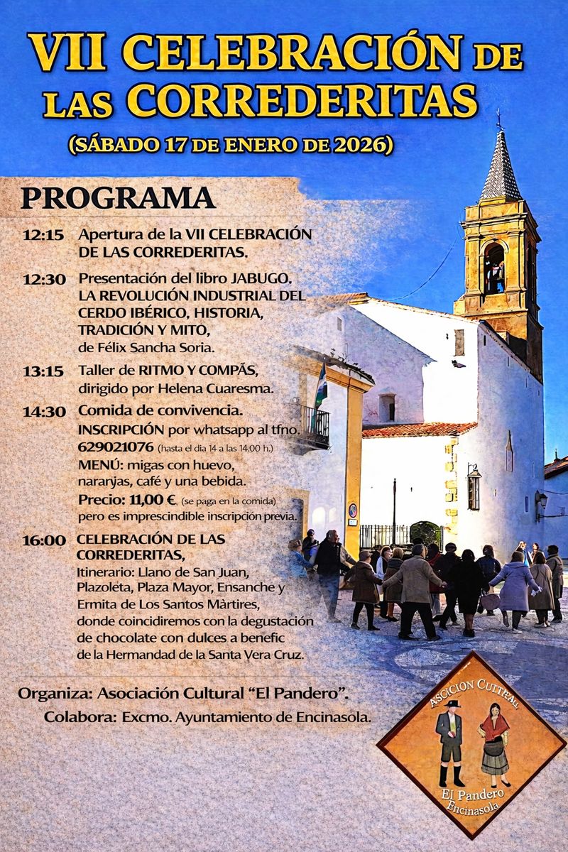 Desde 2015 la Asociación Cultural El Pandero, celebra Las Correderitas el sábado más próximo al 20 de enero. Antes de salir a cantar y bailar por calles y plazas, tenemos otras actividades culturales y nos comemos unas migas. Una pasada. Una gozada. Si vienes un año, repites. Aquí te dejo el cartel con el programa.